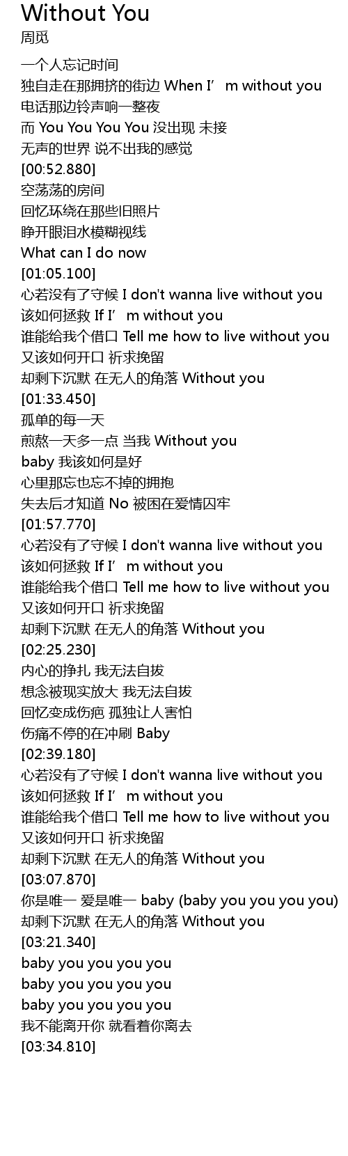 | [03:04.290] | 却剩下沉默 在无人的角落 Without you |