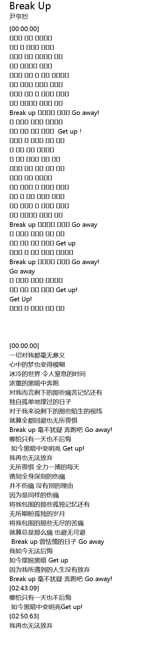 | [01:56.68] | Break up 비겁했던 날들아 Go away |