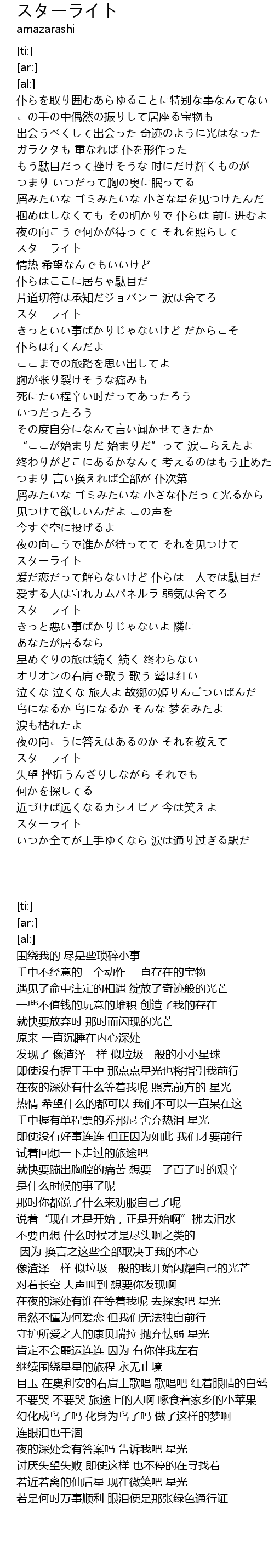 | [01:18.81] | 夜の向こうで何かが待ってて それを照らして スターライト |
