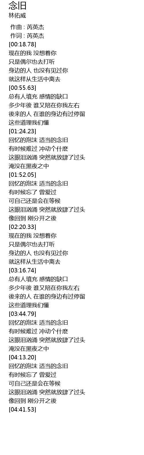| [04:21.86] | 有时候忘了 曾爱过 |