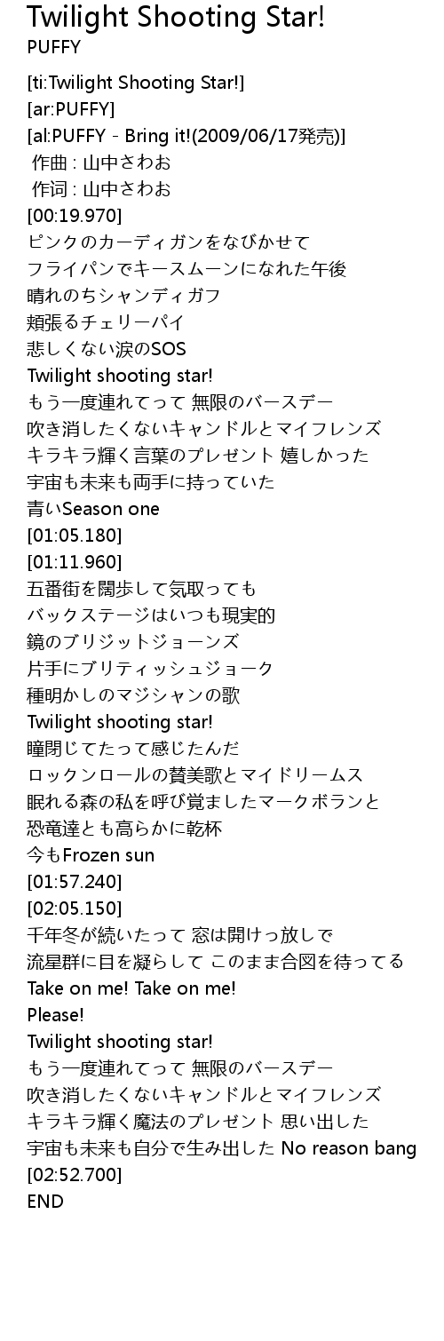 | [02:16.590] | 流星群に目を凝らして このまま合図を待ってる |