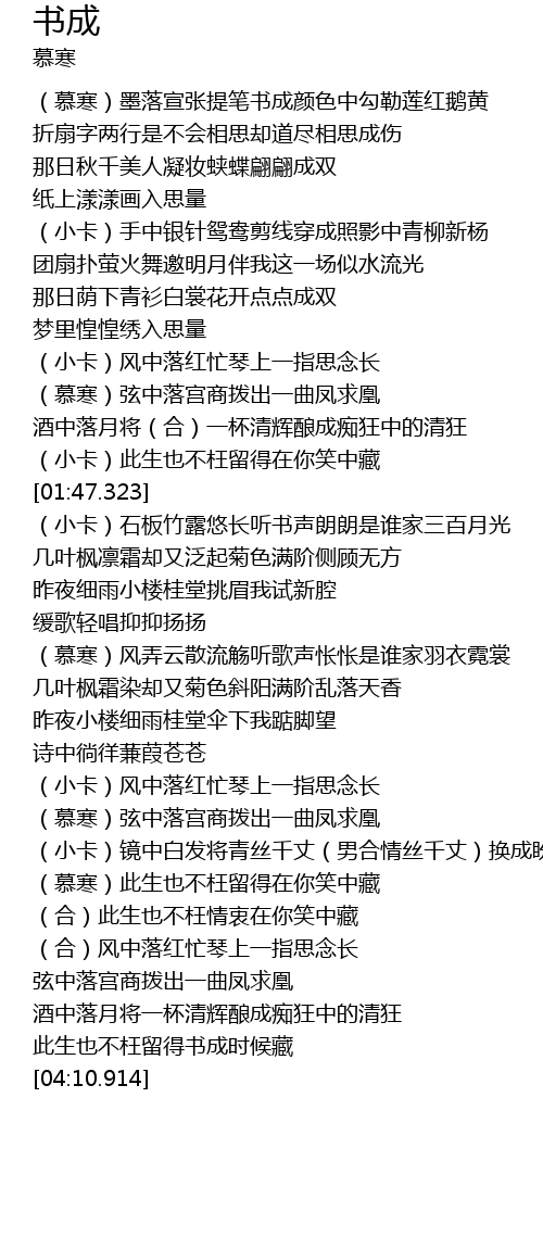 | [00:25.005] | (慕寒)墨落宣张提笔书成颜色中勾勒莲红鹅黄 |