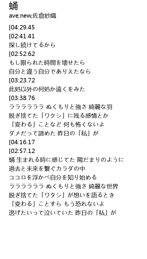 | [01:57.89][04:16.17] | 誰よりも高く舞い上がり 蝶になる |