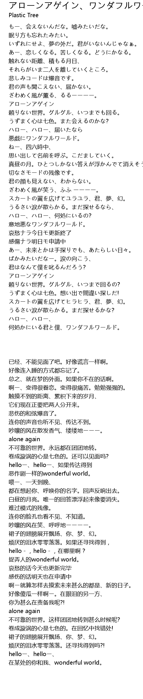 | [04:57.320] | 何処かにいる君と僕、ワンダフルワールド。 |