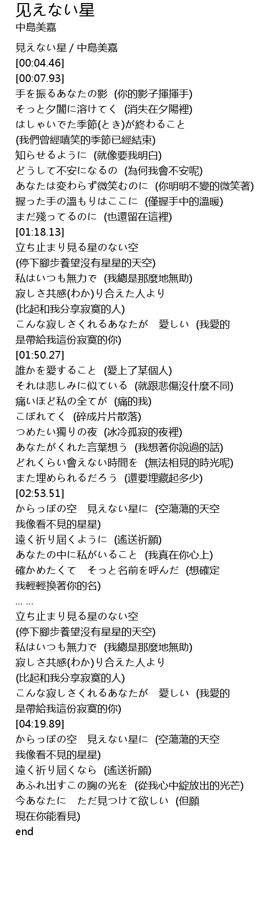 | [04:22.86] | からっぽの空 見えない星に (空蕩蕩的天空 我像看不見的星星) |