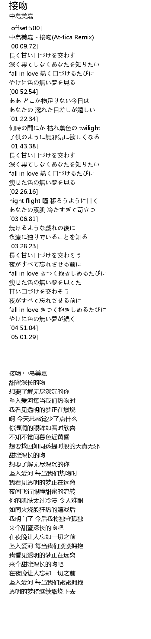 | [00:00.00] | 中島美嘉 - 接吻(At-tica Remix) |