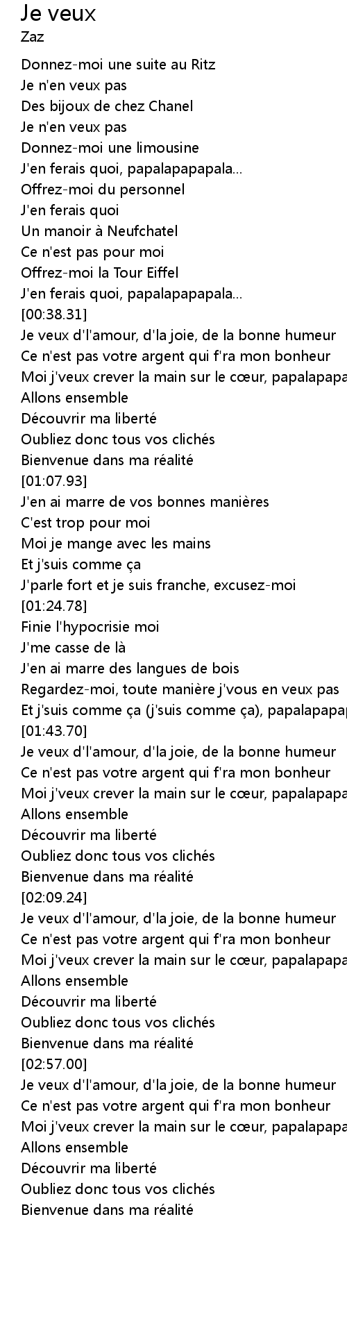| [02:39.01] | Moi j'veux crever la main sur le cœur, papalapapapala... |