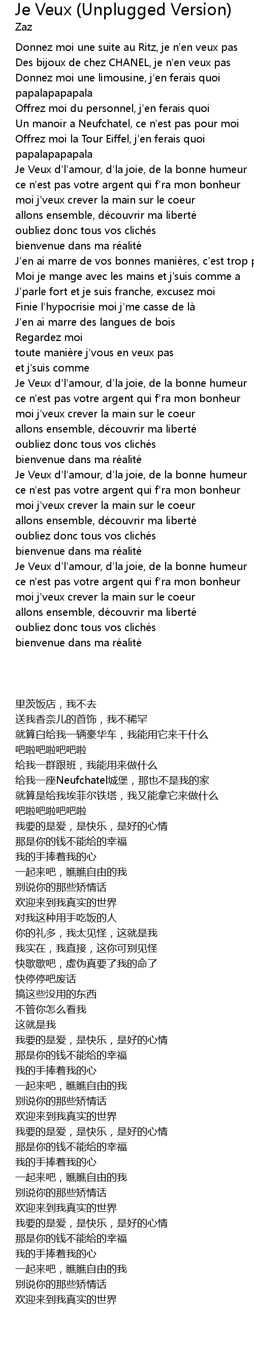 | [02:46.81] | Je Veux d' l' amour, d' la joie, de la bonne humeur |