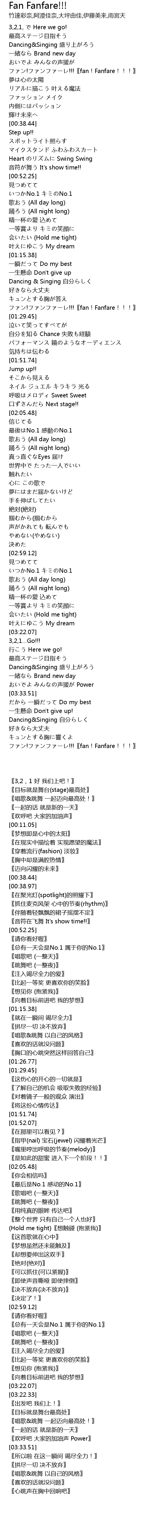 | [01:26.77] | ファン!ファンファーレ!!!〖fan!Fanfare!!!〗 |