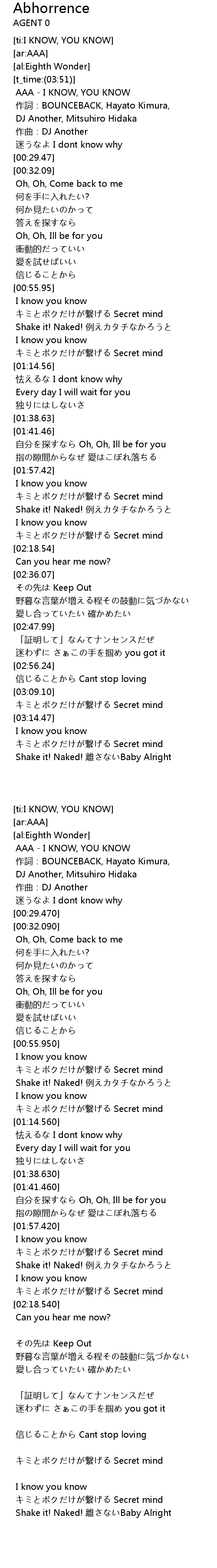 | [00:00.00] | AAA - I KNOW, YOU KNOW |