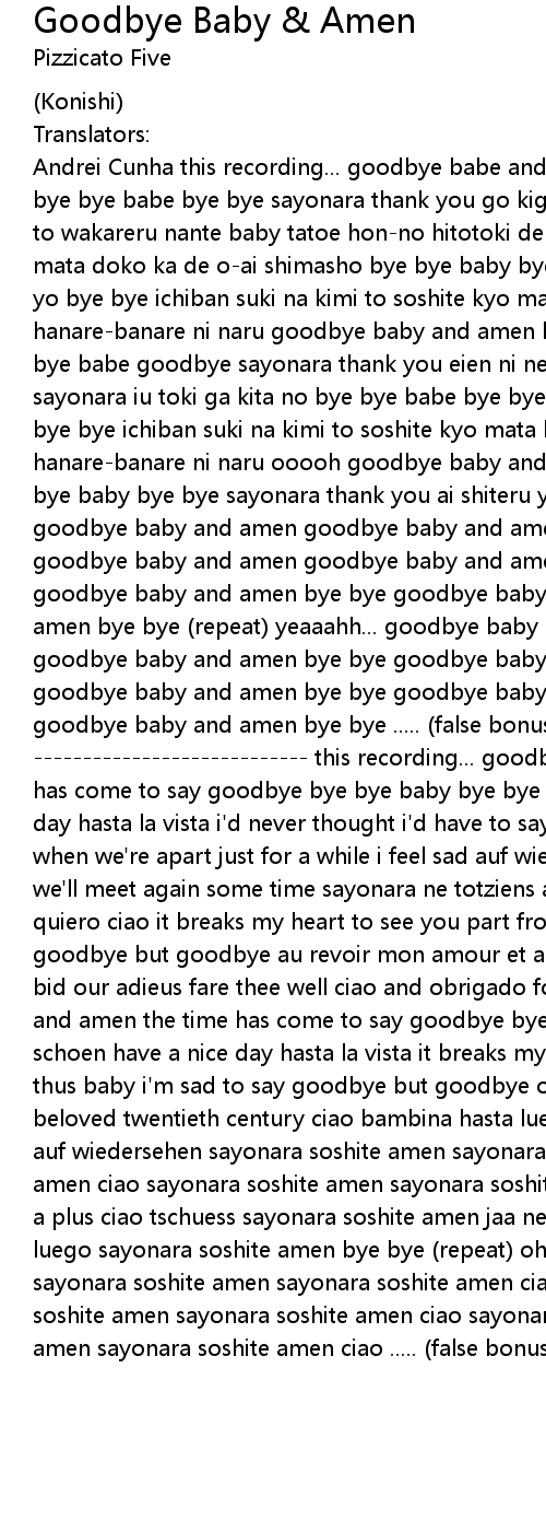 Andrei Cunha this recording... goodbye babe and amen sayonara iu toki ga kita no bye bye babe bye bye sayonara thank you go kigen yo bye bye ichiban suki na kimi to wakareru nante baby tatoe hon-no hitotoki demo kanashii goodbye baby and amen mata doko ka de o-ai shimasho bye bye baby bye bye sayonara thank you ai shiteru yo bye bye ichiban suki na kimi to soshite kyo mata baby kanashii kedo hanare-banare ni naru goodbye baby and amen kuchizuke shite o-wakare desho bye bye babe goodbye sayonara thank you eien ni ne bye bye goodbye babe and amen sayonara iu toki ga kita no bye bye babe bye bye sayonara thank you go kigen yo bye bye ichiban suki na kimi to soshite kyo mata baby kanashii kedo hanare-banare ni naru ooooh goodbye baby and amen dai-suki datta ni-ju seiki bye bye baby bye bye sayonara thank you ai shiteru yo bye bye goodbye baby and amen goodbye baby and amen goodbye baby and amen bye bye goodbye baby and amen goodbye baby and amen goodbye baby and amen bye bye bye bye bye bye bye bye goodbye baby and amen bye bye goodbye baby and amen bye bye goodbye baby and amen bye bye (repeat) yeaaahh... goodbye baby and amen goodbye baby and amen goodbye baby and amen bye bye goodbye baby and amen goodbye baby and amen goodbye baby and amen bye bye goodbye baby and amen goodbye baby and amen goodbye baby and amen bye bye ..... (false bonus track) ---------------------------- this recording... goodbye baby and amen the time has come to say goodbye bye bye baby bye bye au revoir danke schoen have a nice day hasta la vista i'd never thought i'd have to say sayonara to you babe even when we're apart just for a while i feel sad auf wiedersehen liebchen und amen we'll meet again some time sayonara ne totziens arrivederci merci beaucoup te quiero ciao it breaks my heart to see you part from me thus baby i'm sad to say goodbye but goodbye au revoir mon amour et amen the time has come to kiss and bid our adieus fare thee well ciao and obrigado forever gule gule goodbye baby and amen the time has come to say goodbye bye bye baby bye bye au revoir danke schoen have a nice day hasta la vista it breaks my heart to see you part from me thus baby i'm sad to say goodbye but goodbye ooooh goodbye baby and amen my beloved twentieth century ciao bambina hasta luego merci et a plus i love you auf wiedersehen sayonara soshite amen sayonara soshite amen sayonara soshite amen ciao sayonara soshite amen sayonara soshite amen sayonara soshite amen ciao a plus ciao tschuess sayonara soshite amen jaa ne sayonara soshite amen hasta luego sayonara soshite amen bye bye (repeat) oh oui! sayonara soshite amen sayonara soshite amen sayonara soshite amen ciao sayonara soshite amen sayonara soshite amen sayonara soshite amen ciao sayonara soshite amen sayonara soshite amen sayonara soshite amen ciao ..... (false bonus track) |