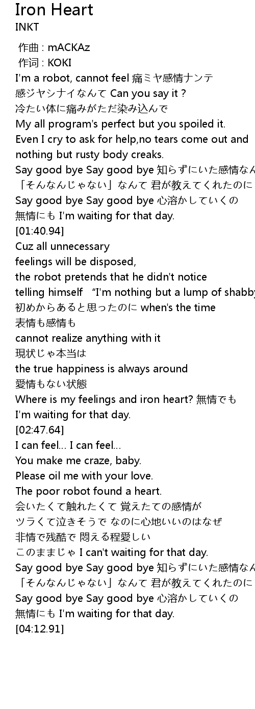 | [00:44.30] | I'm a robot, cannot feel 痛ミヤ感情ナンテ |