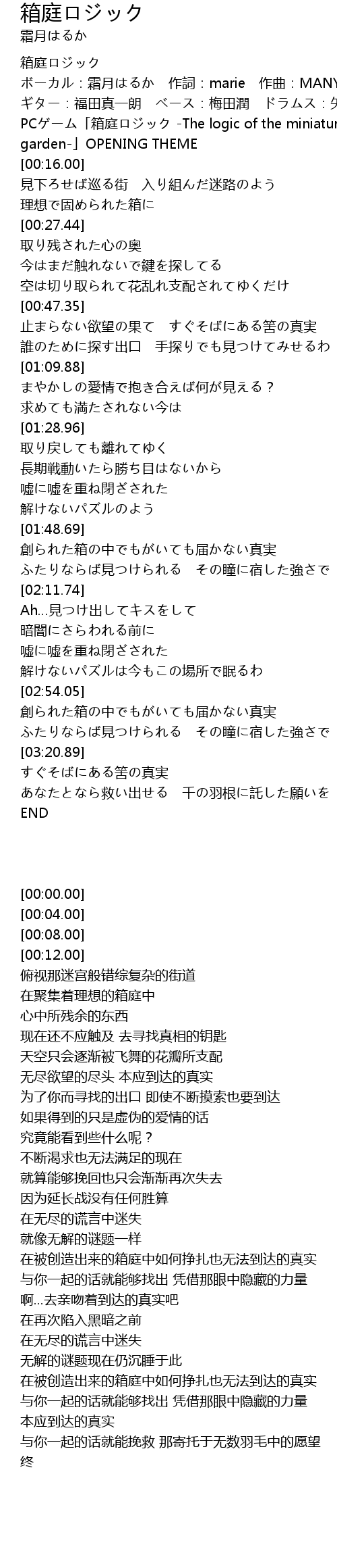 | [00:12.00] | PCゲーム「箱庭ロジック ‐The logic of the miniature garden‐」OPENING THEME |