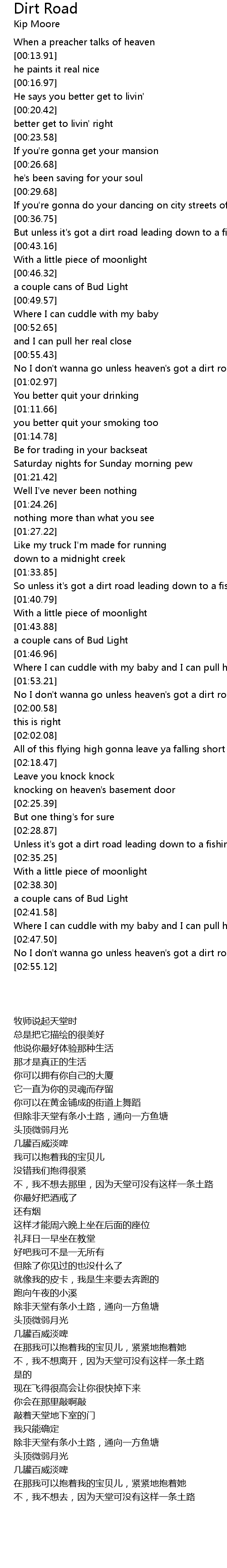 | [02:49.00] | No I don't wanna go unless heaven's got a dirt road |