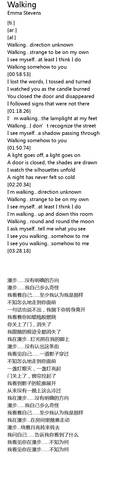 | [01:18.42] | I’m walking…the lamplight at my feet |