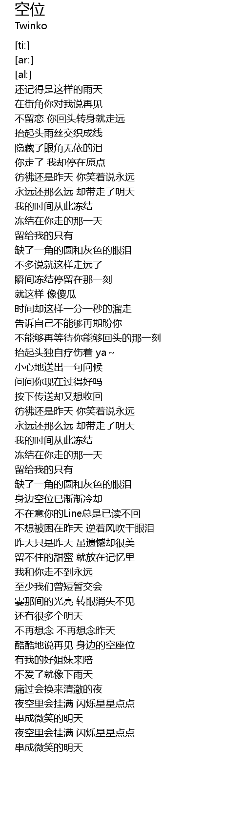 | [03:28.35] | 酷酷地说再见 身边的空座位 |