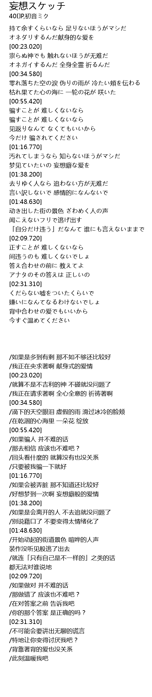 | [01:32.740] | 梦见ていたいの 妄想癖な爱を |