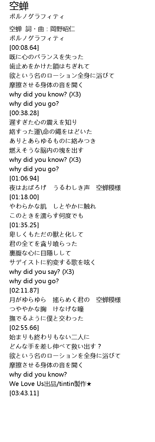 | [00:01.52] | 空蝉 詞・曲:岡野昭仁 |