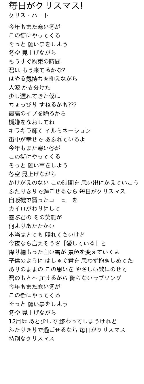 | [04:17.525] | ふたりきりで過ごせるなら 毎日がクリスマス |