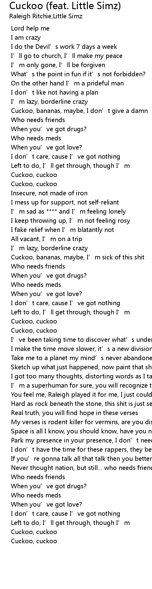 | [02:01.586] | Cuckoo, bananas, maybe, I' m sick of this shit |