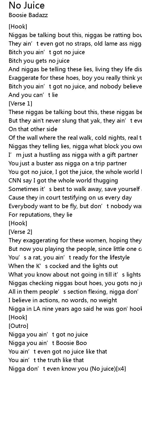| Niggas checking niggas bout hoes, you gots no juice | |