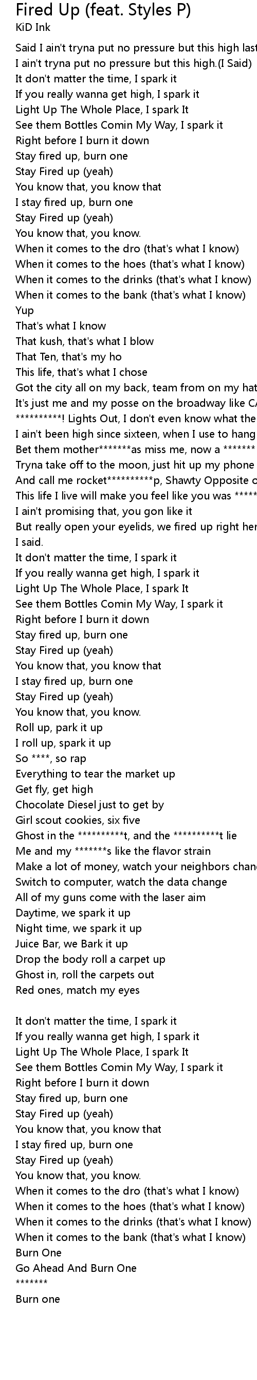 | I stay fired up, burn one | |