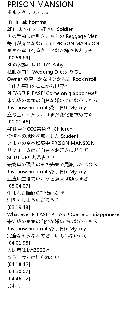 | [00:44.92] | 毎日が賑やかなここは PRISON MANSION |