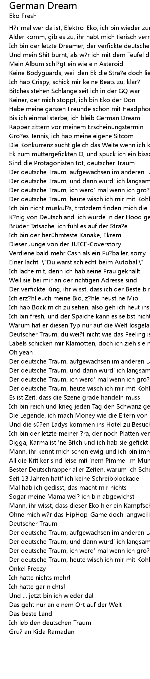 | [01:44.08] | Deutscher Traum, du wei?t nicht wie das Feeling ist, Mann |