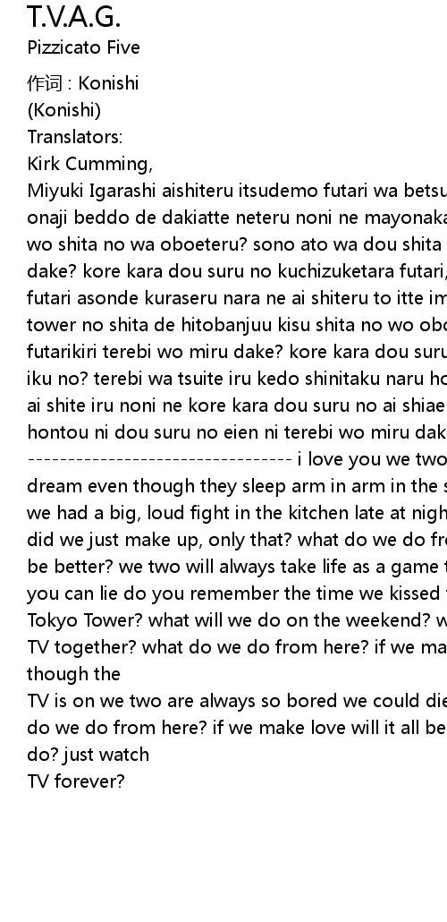 | Miyuki Igarashi aishiteru itsudemo futari wa betsubetsuna yume wo mite iru onaji beddo de dakiatte neteru noni ne mayonaka no daidokoro de hade ni oogenka wo shita no wa oboeteru? sono ato wa dou shita no nakanaori suru dake, sore dake? kore kara dou suru no kuchizuketara futari, umaku iku no? itsumademo futari asonde kuraseru nara ne ai shiteru to itte ima sugu, uso de ii kara tokyo tower no shita de hitobanjuu kisu shita no wo oboeteru? shuumatsu wa dou suru no futarikiri terebi wo miru dake? kore kara dou suru no ai shiaeba futari umaku iku no? terebi wa tsuite iru kedo shinitaku naru hodo futari wa itsumo taikutsu ai shite iru noni ne kore kara dou suru no ai shiaeba futari umaku iku no? hontou ni dou suru no eien ni terebi wo miru dake? i love you we two always dream a different dream even though they sleep arm in arm in the same bed do you remember the time we had a big, loud fight in the kitchen late at night? what happened after that? did we just make up, only that? what do we do from here? if we kiss will it all be better? we two will always take life as a game tell me you love me right now, you can lie do you remember the time we kissed the night away under | |