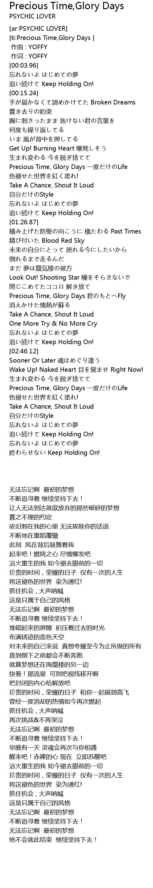 | [03:21.48] | Precious Time, Glory Days yí dù Life |