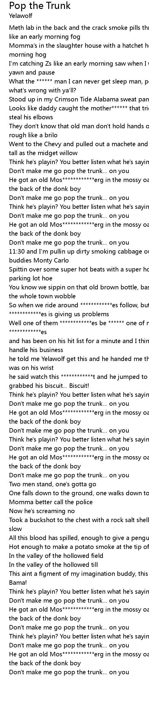 | [03:19.42] | He got an old Mos************erg in the mossy oak duffle bag layin in the back of the donk boy |