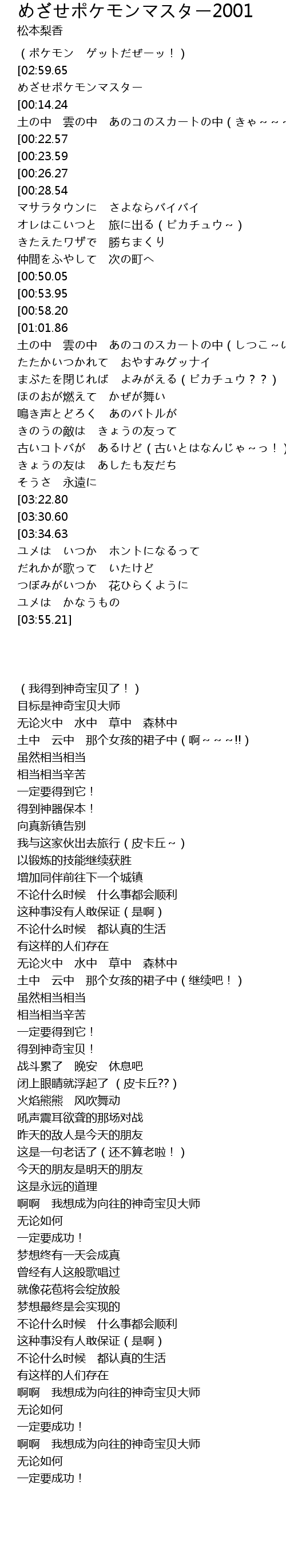 | [03:38.81][03:22.80][02:10.65] | ああ あこがれの ポケモンマスターに |