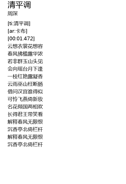 | [01:42.347] | 沉香亭北倚栏杆 |
