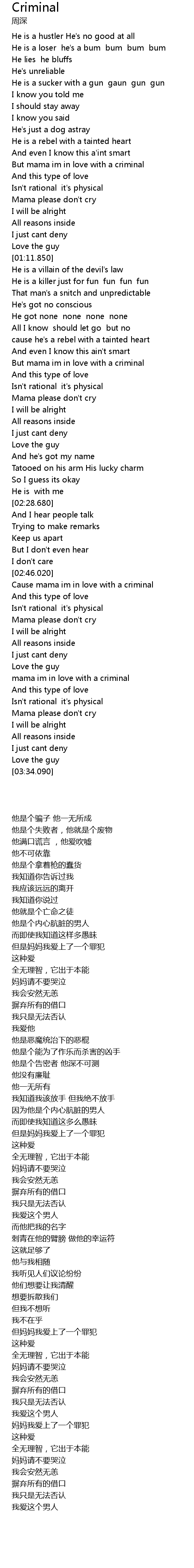 | [02:57.550] | Cause mama im in love with a criminal |