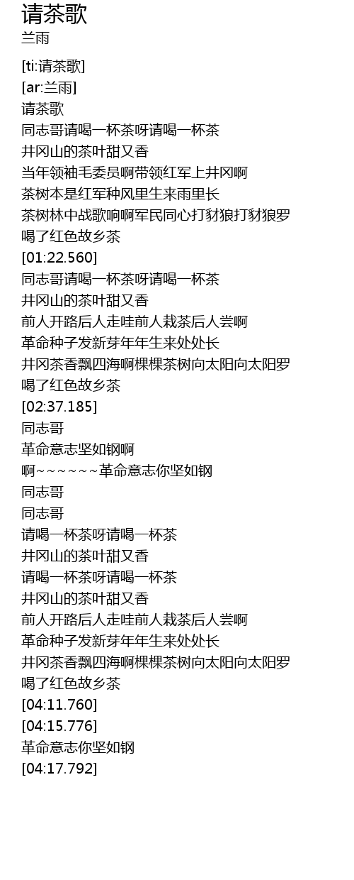 | [04:01.951] | 井冈茶香飘四海啊棵棵茶树向太阳向太阳罗 |