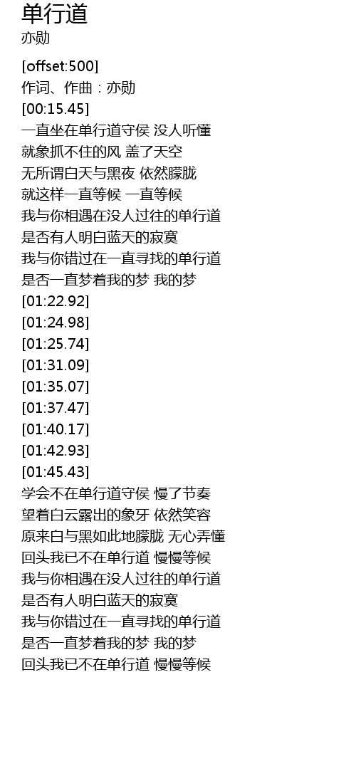 | [01:51.50] | 学会不在单行道守侯 慢了节奏 |