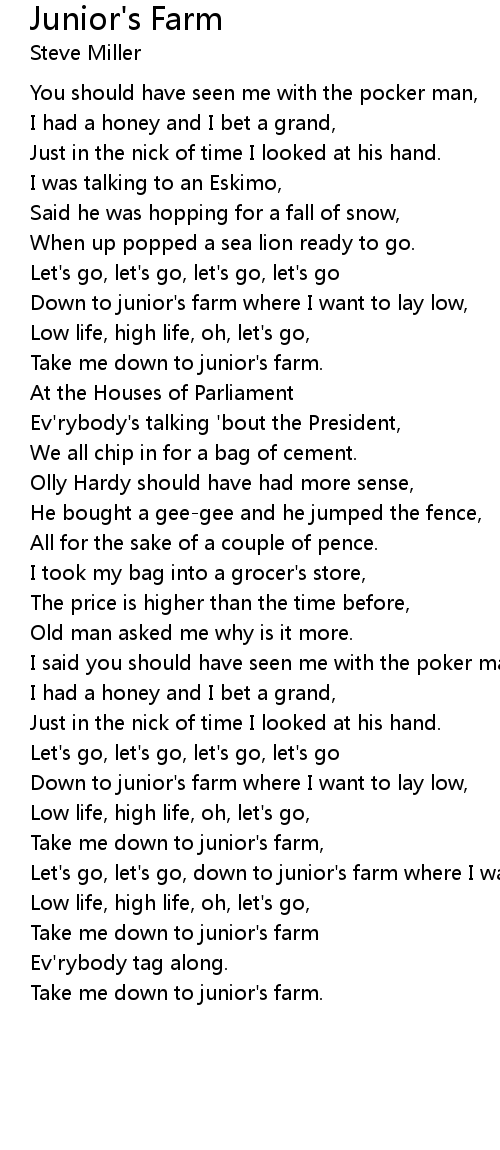 Let's go, let's go, down to junior's farm where I want to lay low. |
