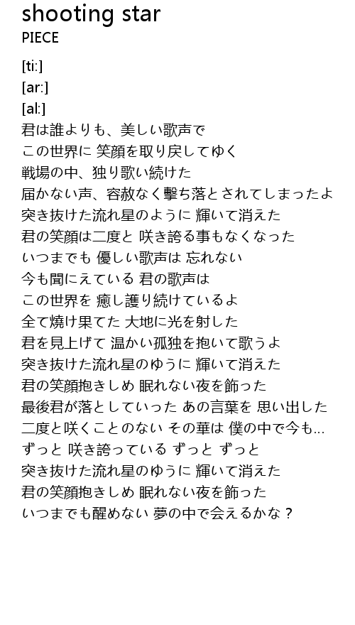 | [03:18.77] | 突き抜けた流れ星のゆうに 輝いて消えた |