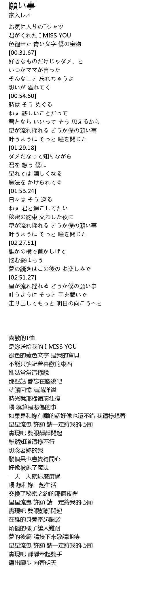 | [03:11.36] | 星が流れ揺れる どうか僕の願い事 |