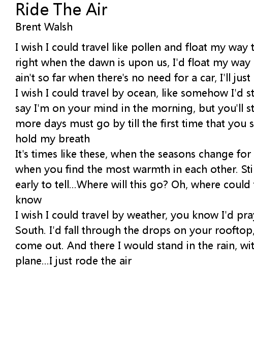 I wish I could travel by weather, you know I'd pray that this storm front heads South. I'd fall through the drops on your rooftop, and you'd hear me and have to come out. And there I would stand in the rain, with no car, no boat and no plane...I just rode the air |