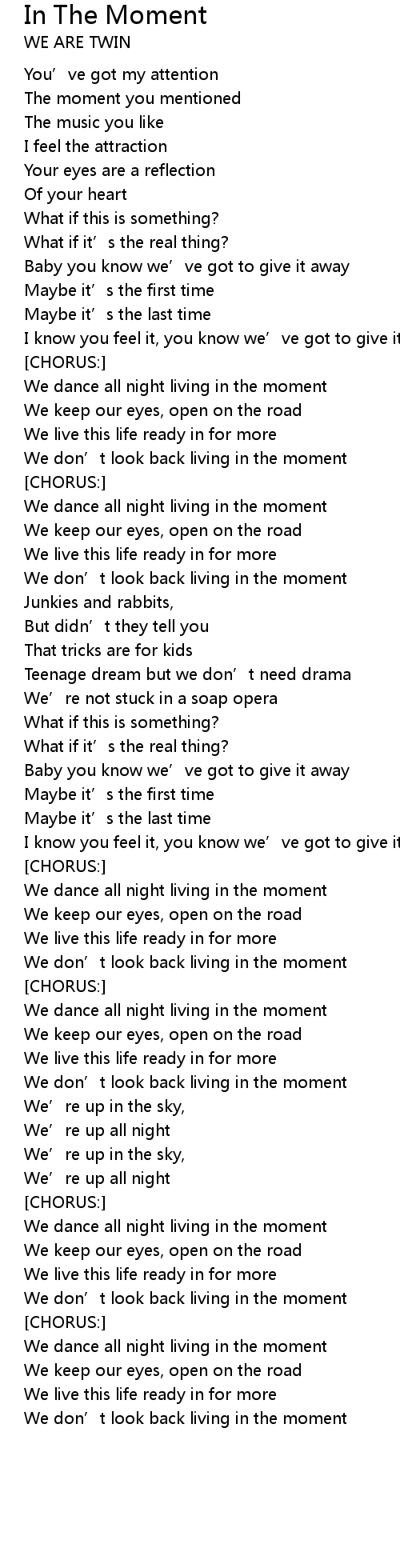 | We dance all night living in the moment | |