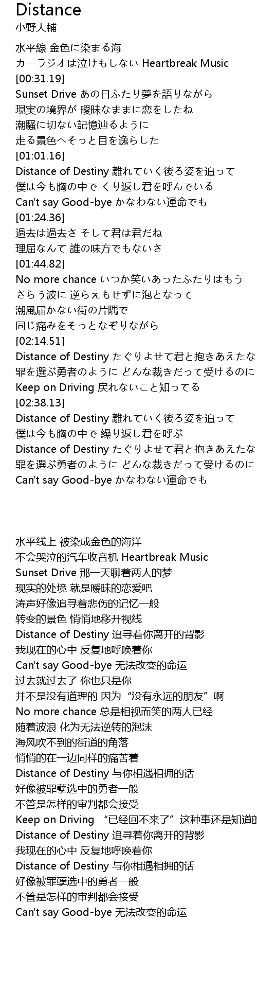 | [01:01.72] | Distance of Destiny 離れていく後ろ姿を追って |