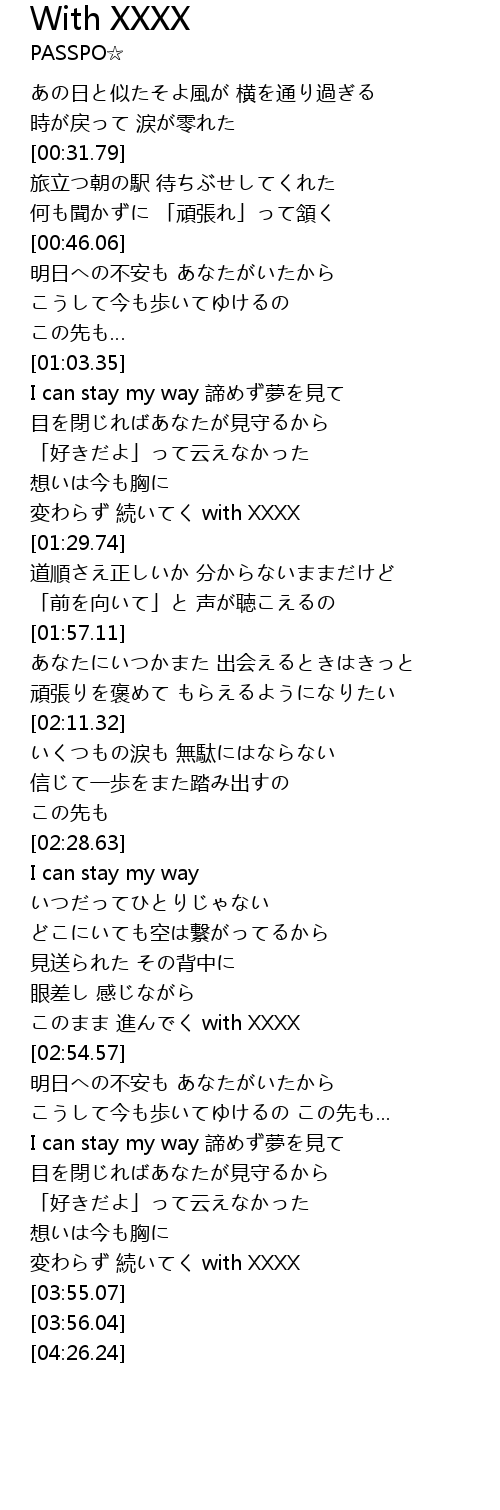 | [03:50.88] | 変わらず 続いてく with XXXX |