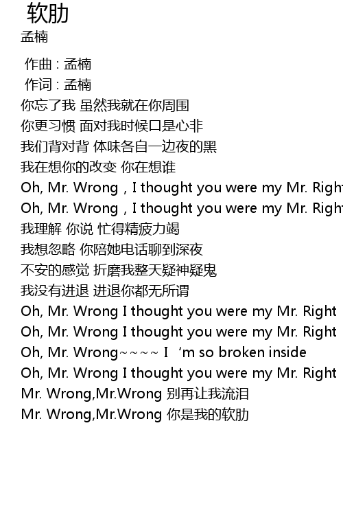 | [03:05.09] | Mr. Wrong, Mr. Wrong nǐ shì wǒ de ruǎn lèi |