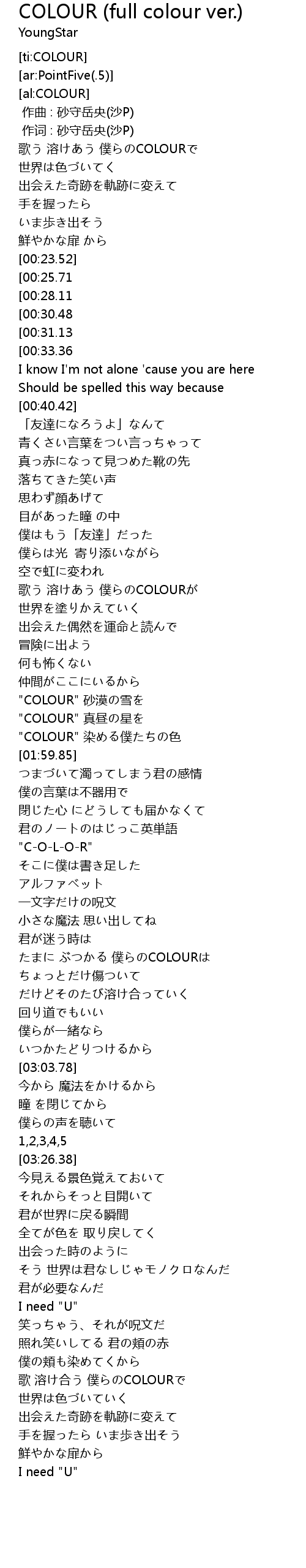 | [04:31.33][00:25.71] | "COLOUR" |