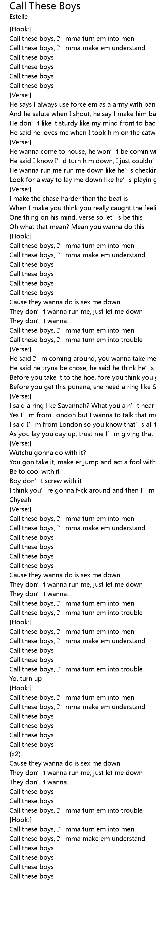 | Call these boys, I’mma turn em into men | |