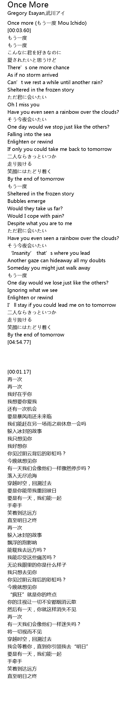 | [00:01.17] | Once more yi du Mou Ichido |