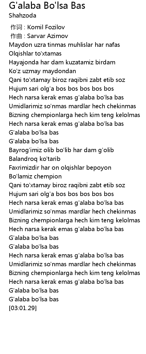 | [02:57.99] | G'alaba bo'lsa bas |