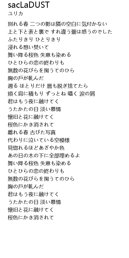 | [01:50.67] | 煩く肩に積もり ずっとね 囁く 涙の屑 |