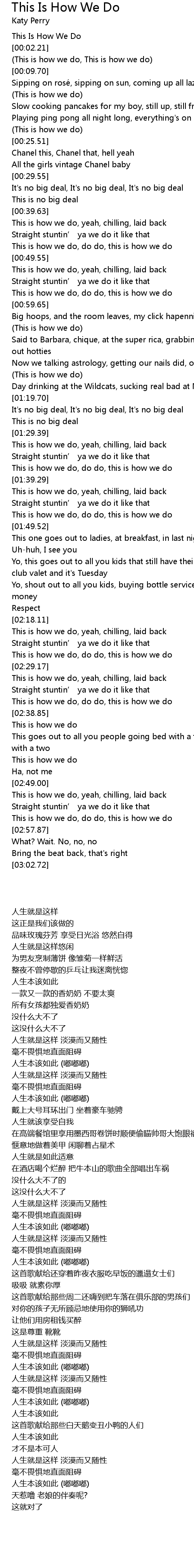 | [00:05.64] | This is how we do, This is how we do |